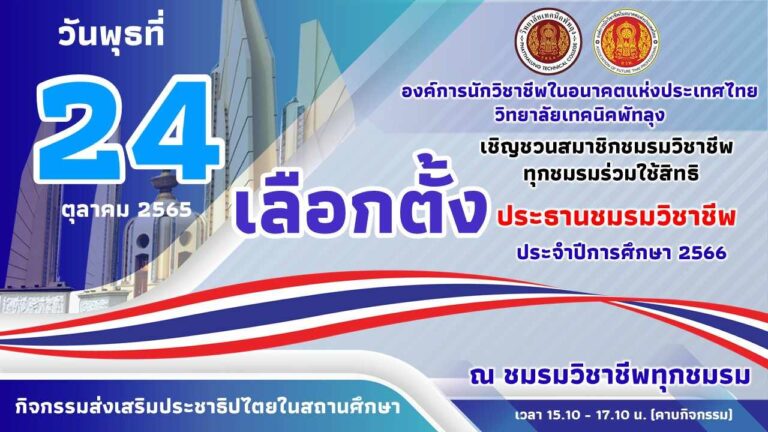 ขอเชิญชวนสมาชิกชมรมวิชาชีพทุกชมรมร่วมใช้สิทธิเลือกตั้งประธานชมรมวิชาชีพ ประจำปีการศึกษา 2566