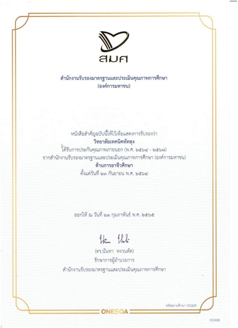 วิทยาลัยเทคนิคพัทลุง ได้รับการประกันคุณภาพภายนอก (พ.ศ.๒๕๖๔ -๒๕๖๘) ด้านการอาชีวศึกษา จากสำนักงานรับรองมาตรฐานและประเมินคุณภาพการศึกษา (องค์การมหาชน)