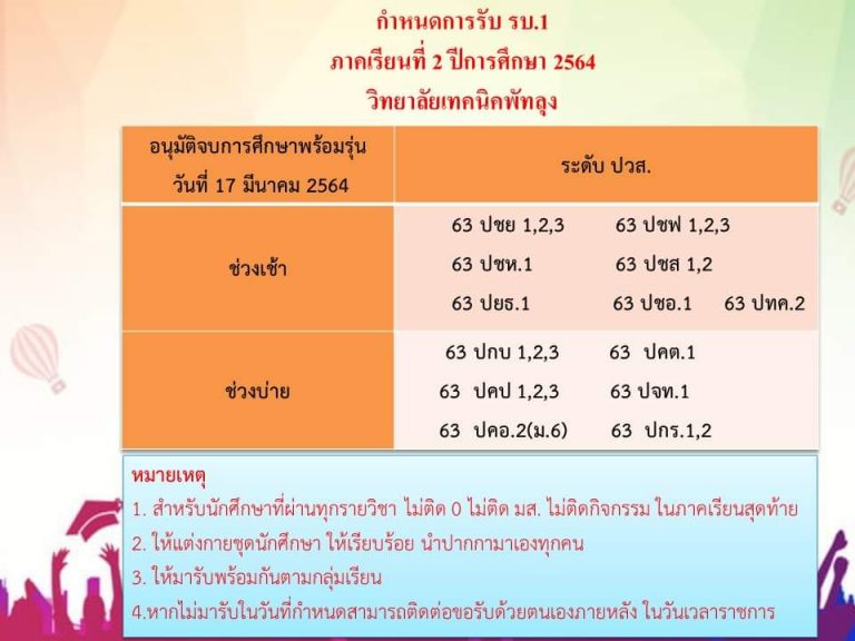 เรื่อง กำหนดรับใบ รบ.1 ภาคเรียนที่ 2 ปีการศึกษา 2564 อนุมัติจบการศึกษาพร้อมรุ่น วันที่ 17 มีนาคม 2565 ระดับ ปวส. ให้มารับตามกลุ่มที่ประกาศ ภายในวันที่ 30 มีนาคม 2565 ตามเวลาที่กำหนด