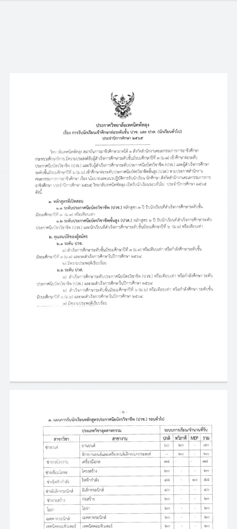 ประกาศวิทยาลัยเทคนิคพัทลุง เรื่อง การรับนักเรียนเข้าศึกษาต่อระดับชั้น ปวช.และปวส.(นักเรียนทั่วไป) ประจำปีการศึกษา 2565