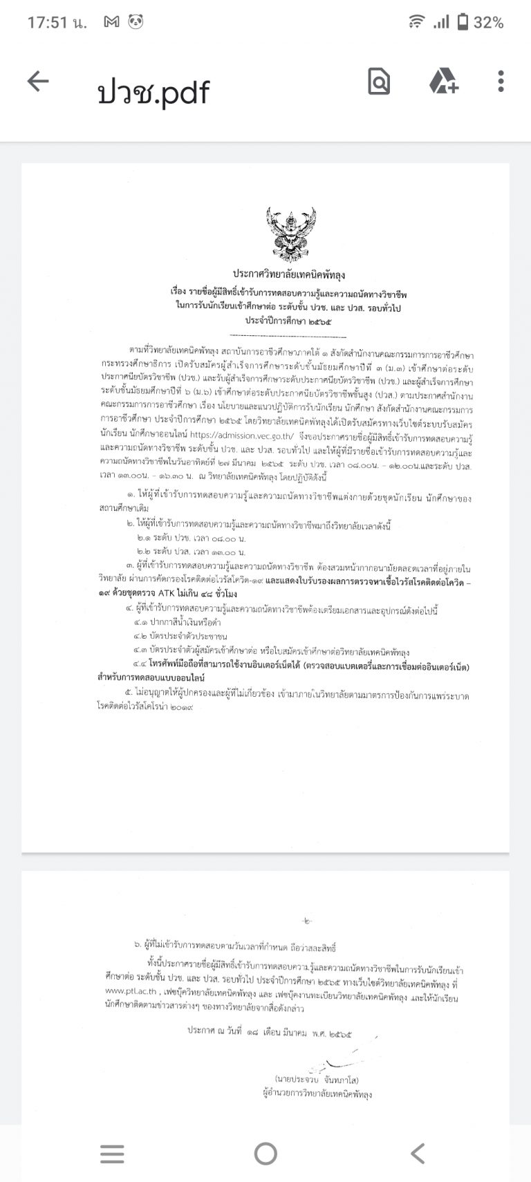 ประกาศวิทยาลัยเทคนิคพัทลุง เรื่อง รายชื่อผู้มีสิทธิ์เข้ารับการทดสอบความรู้และความถนัดทางวิชาชีพในการรับนักเรียนเข้าศึกษาต่อ ระดับชั้น ปวช. และ ปวส. รอบทั่วไป ประจำปีการศึกษา 2565
