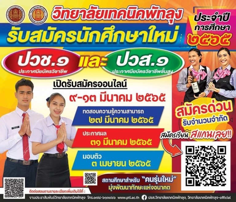 วิทยาลัยเทคนิคพัทลุง เปิดรับสมัครนักศึกษาใหม่ ประจำปีการศึกษา 2565 ระดับประกาศนียบัตรวิชาชีพ (ปวช.1) และ ประกาศนียบัตริวิชาชีพชั้นสูง (ปวส.1)