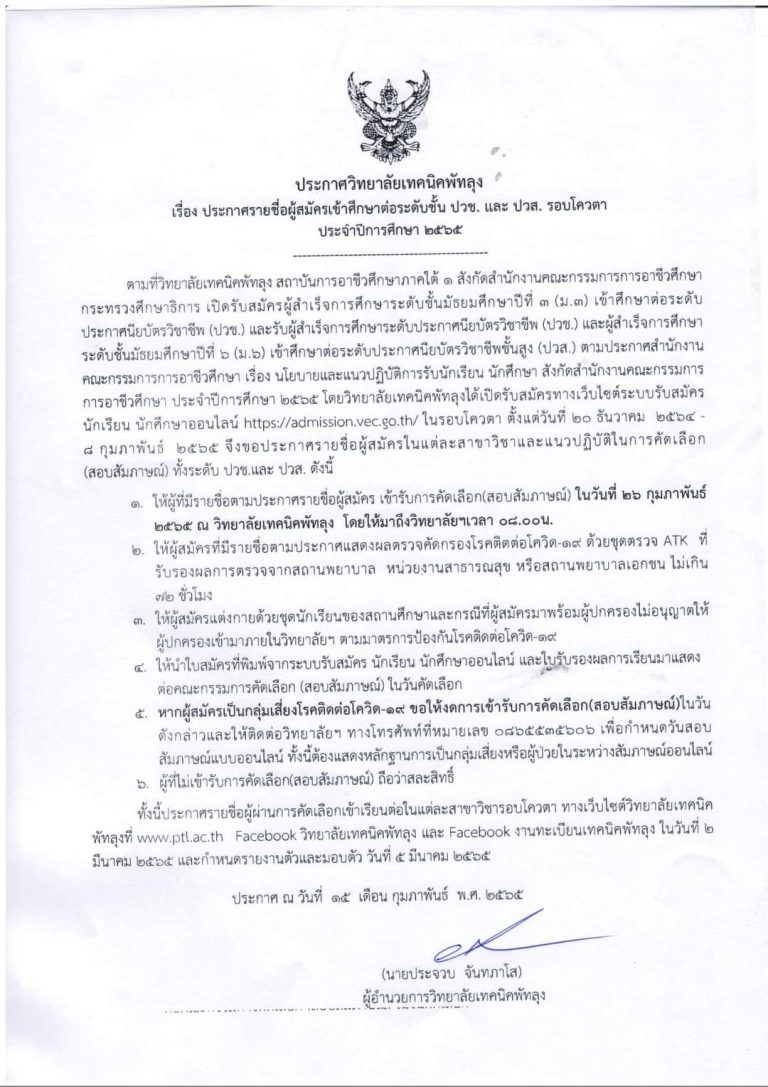 ประกาศวิทยาลัยเทคนิคพัทลุง เรื่อง รายชื่อนักเรียน นักศึกษาที่ผ่านการคัดเลือกเพื่อเข้าศึกษาต่อวิทยาลัยเทคนิคพัทลุง ระดับ ปวช. ประจำปีการศึกษา 2565 (รอบโควตา)