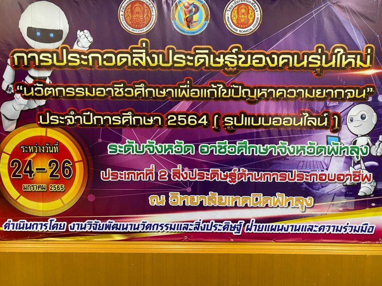 ดร.ประจวบ จันทภาโส ผู้อำนวยการวิทยาลัยเทคนิคพัทลุง ประธานกรรมการอาชีวศึกษา เป็นประธานเปิดการประกวดสิ่งประดิษฐ์ของคนรุ่นใหม่ “นวัตกรรมอาชีวศึกษาเพื่อแก้ไขปัญหาความยากจน” ประจำปีการศึกษา 2564 (รูปแบบออนไลน์) ระดับจังหวัด
