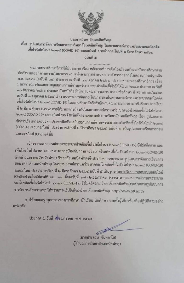 รูปแบบการจัดการเรียนการสอน วิทยาลัยเทคนิคพัทลุง ในสถานการณ์การแพร่ระบาดของโรคติดเชื้อไวรัสโคโรน่า 2019 (COVID-19) ระลอกใหม่ ประจำภาคเรียนที่ 2 ปีการศึกษา 2564 ฉบับที่ 5