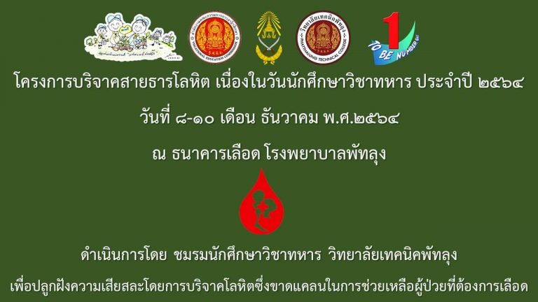 ชมรมนักศึกษาวิชาทหาร ขอเชิญ นักศึกษาวิชาทหาร วิทยาลัยเทคนิคพัทลุง และในจังหวัดพัทลุง ร่วมบริจาคโลหิต เนื่องในวันนักศึกษาวิชาทหาร ณ ธนาคารเลือด โรงพยาบาลพัทลุง