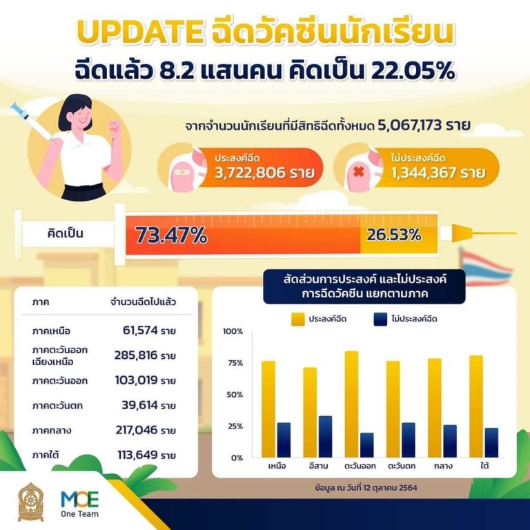 ข้อมูลฉีดวัคซีนนักเรียน ฉีดแล้ว 8.2 แสนคน คิดเป็น 22.05% ยังเป็นไปตามแผนที่กำหนด ส่วนผู้ไม่ประสงค์ฉีด 1.3 ล้านคน