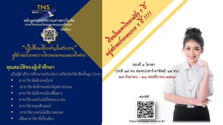 สนใจศึกษาต่อ หลักสูตรอุตสาหกรรมศาสตรบัณฑิต สาขาวิชาระบบโทรคมนาคมและเครือข่าย (ต่อเนื่อง) เรียน 2 ปี ป.ตรี