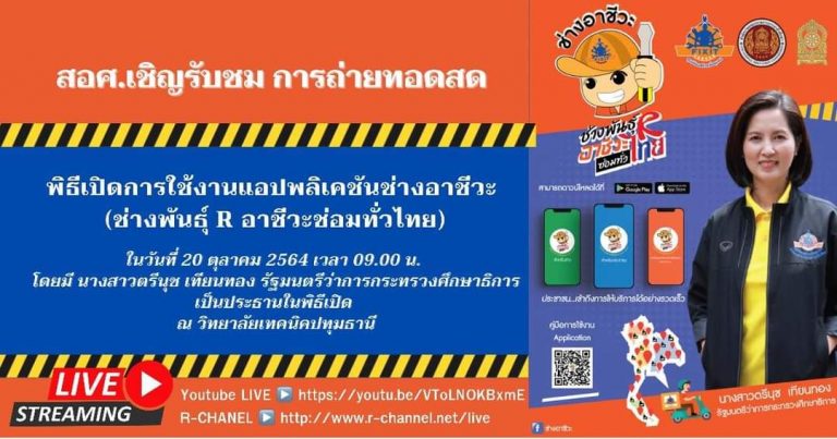 สำนักงานคณะกรรมการการอาชีวศึกษา(สอศ.) ขอเชิญรับชมการถ่ายทอดสด พิธีเปิดการใช้งานแอปพลิเคชันช่างอาชีวะ (ช่างพันธุ์ R อาชีวะช่อมทั่วไทย)