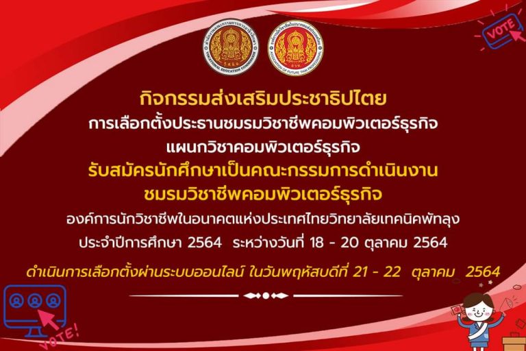 : ประชาสัมพันธ์ จากแผนกวิชาคอมพิวเตอร์ธุรกิจ วิทยาลัยเทคนิคพัทลุง เรื่องการรับสมัคร เลือกตั้งประธานชมรมคอมพิวเตอร์ธุรกิจ ประจำ ปีการศึกษา 2565 ในระหว่างวันที่ 18 – 20 ตุลาคม 2564