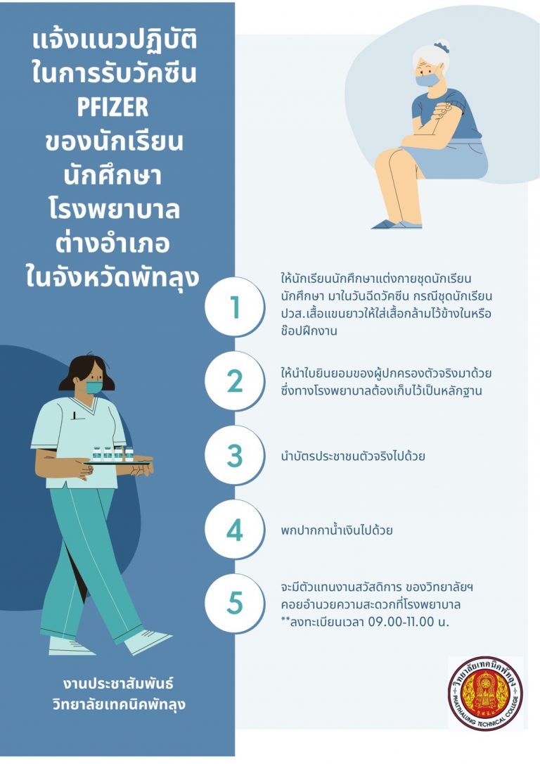 แจ้งแนวปฏิบัติในการรับวัคซีนPFIZERของนักเรียนนักศึกษาโรงพนาบาลต่างอำเภอจังหวัดพัทลุง