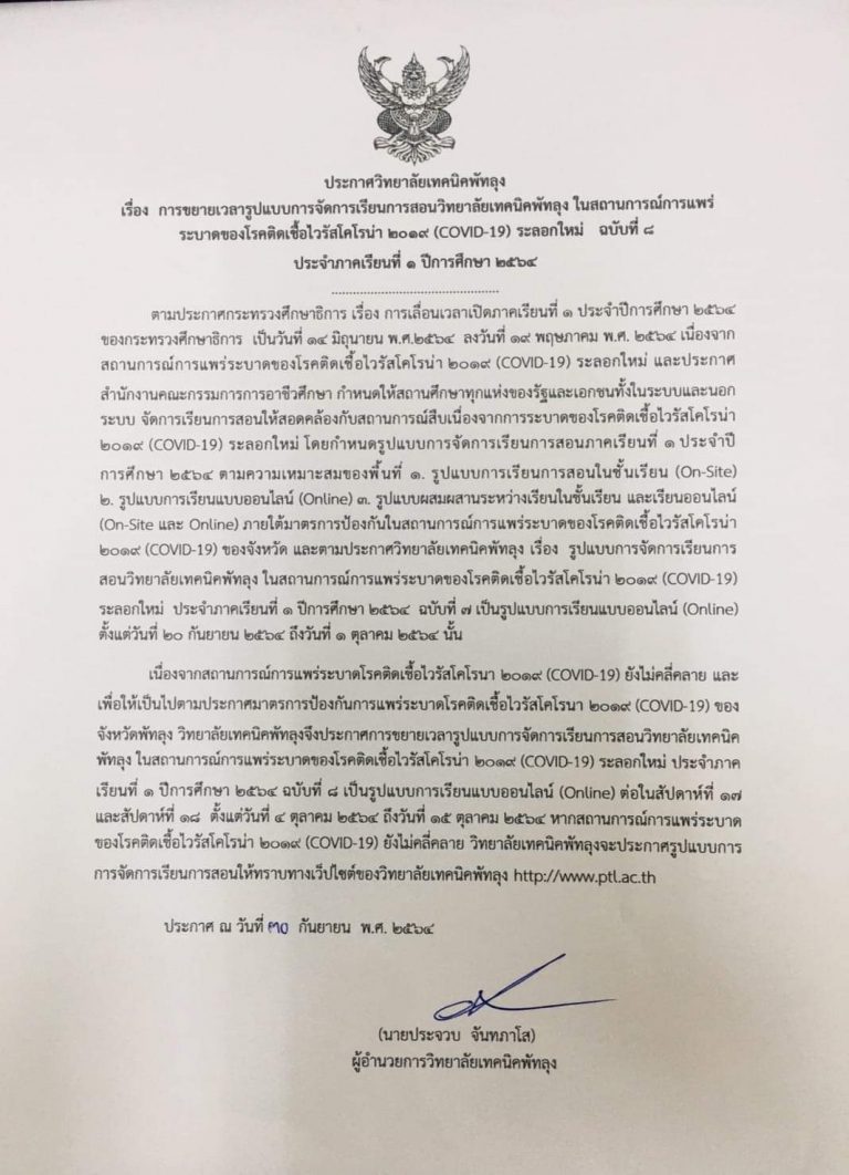 ประกาศวิทยาลัยเทคนิคพัทลุง เรื่อง การขยายเวลารูปแบบการจัดการเรียนการสอนวิทยาลัยเทคนิคพัทลุง ในสถานการณ์การแพร่ระบาดของโรคติดเชื้อไวรัสโคโรน่า 2019 (COVID-19) ระลอกใหม่ ฉบับที่ 8 ประจำภาคเรียนที่ 1 ปีการศึกษา 2564