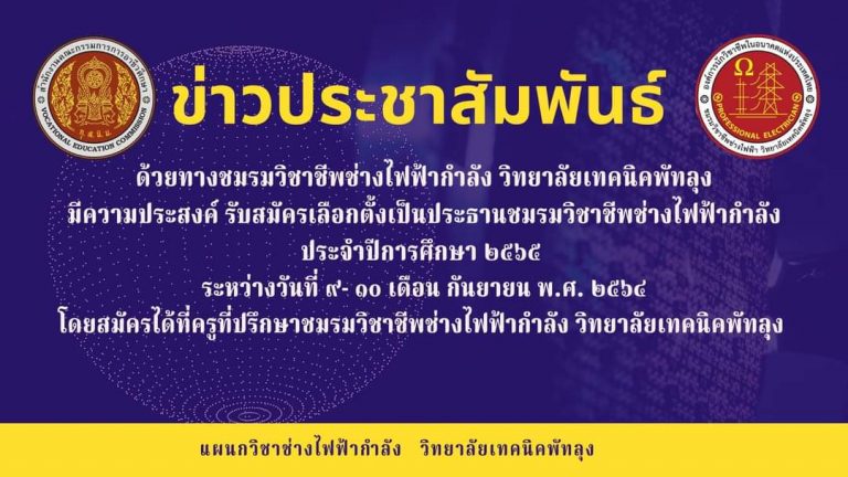 ข่าวประชาสัมพันธ์ ด้วยชมรมวิชาชีพช่างไฟฟ้ากำลัง วิทยาลัยเทคนิคพัทลุง มีความประสงค์รับสมัครเลือกตั้งเป็นประธานชมรมวิชาชีพช่างไฟฟ้ากำลัง ประจำปีการศึกษา 2565