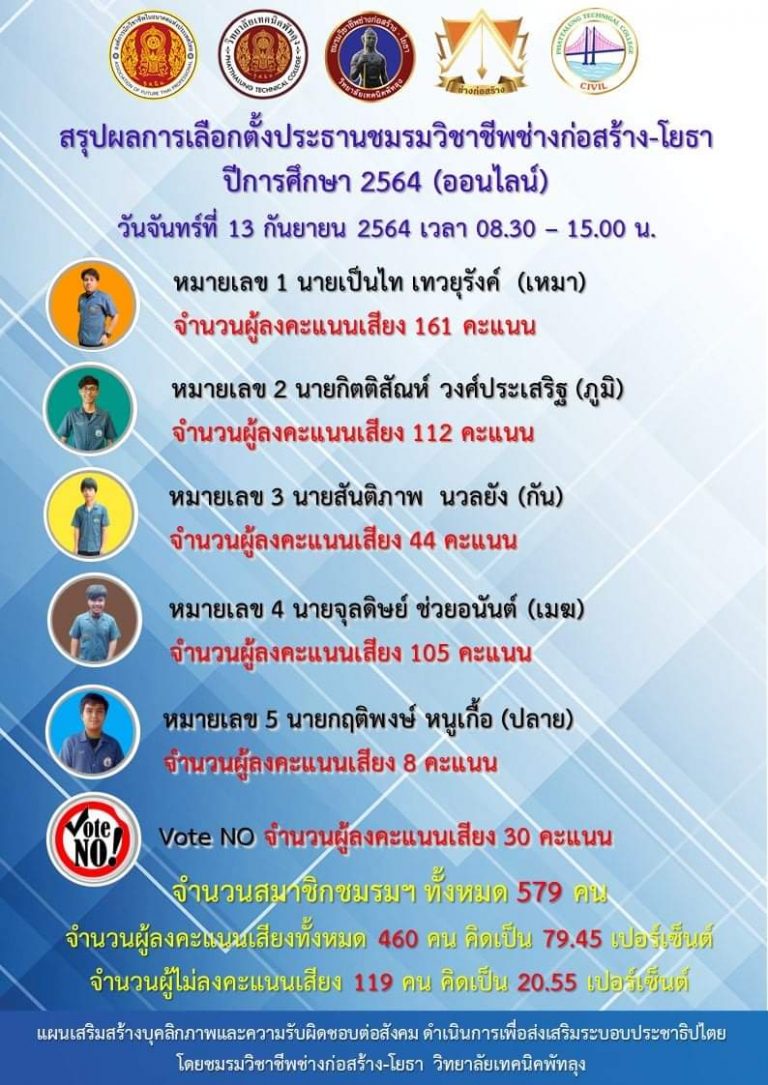 สรุปผลการเลือกตั้งประธานชมรมวิชาชีพช่างก่อสร้าง-โยธา ปีการศึกษา 2564 (ออนไลน์)