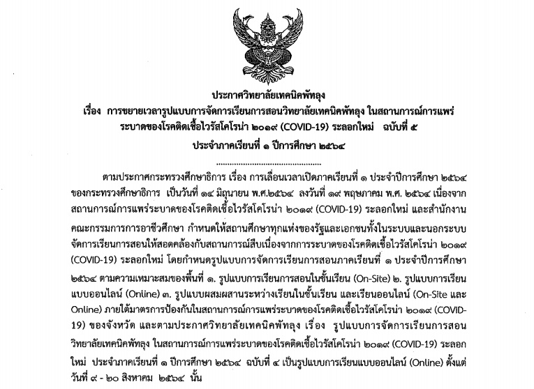 ประกาศวิทยาลัยเทคนิคพัทลุง เรื่อง การขยายเวลารูปแบบการจัดการเรียนการสอนวิทยาลัยเทคนิคพัทลุง ในสถานการณ์การแพร่ระบาดของโรคติดเชื้อไวรัสโคโรน่า 2019 (COVID-19) ระลอกใหม่ ฉบับที่ 5 ประจำภาคเรียนที่ 1 ปีการศึกษา 2564