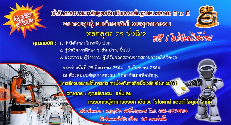 โครงการฝึกอบรมหลักสูตรวิชาชีพระยะสั้นฐานสมรรถนะ E to E งานควบคุมหุ่นยนต์การผลิตในงานอุตสาหกรรม หลักสูตร 75 ชั่วโมง ระหว่างวันที่ 25 สิงหาคม 2564 ถึงวันที่ 3 กันยายน 2564 ณ ห้องหุ่นยนต์อุตสาหกรรม วิทยาลัยเทคนิคพัทลุง