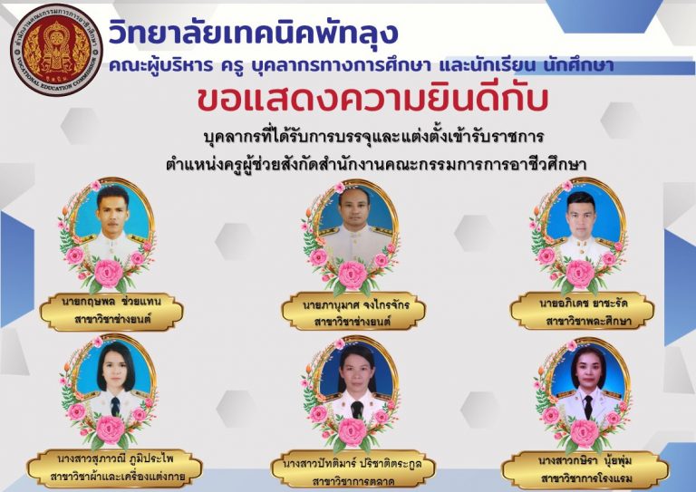 คณะผู้บริหารครูบุคลากรวิทยาลัยเทคนิคพัทลุงขอแสดงความยินดีกับบุคลากร ที่ได้รับการบรรจุและแต่งตั้งเข้ารับราชการตำแหน่งครูผู้ช่วยสังกัดสำนักงานคณะกรรมการการอาชีวศึกษา