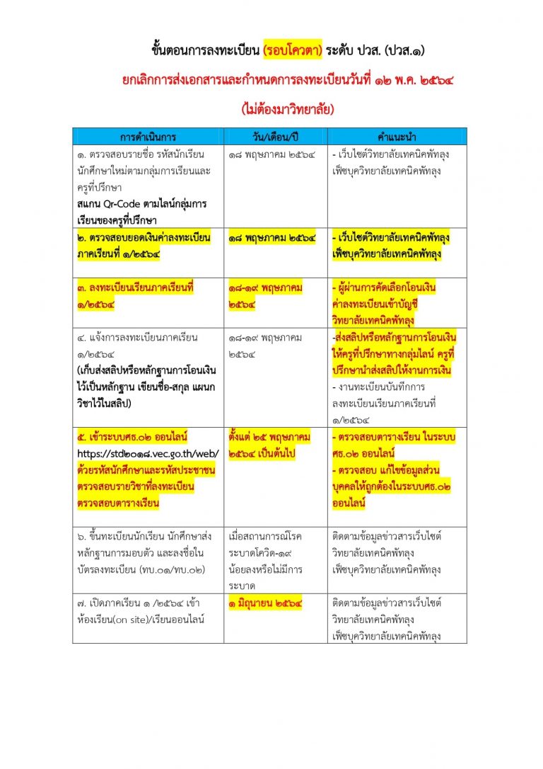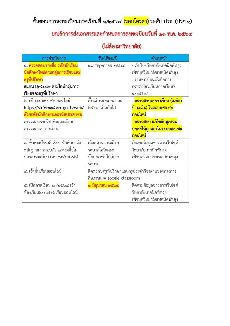 กำหนดการและขั้นตอนการลงทะเบียนภาคเรียนที่ 1/2564 (รอบโควตา) ระดับ ปวส. (ปวส.1) ยกเลิกการส่งเอกสารและกำหนดการลงทะเบียนวันที่ 12 พ.ค. 2564 (ไม่ต้องมาวิทยาลัย)