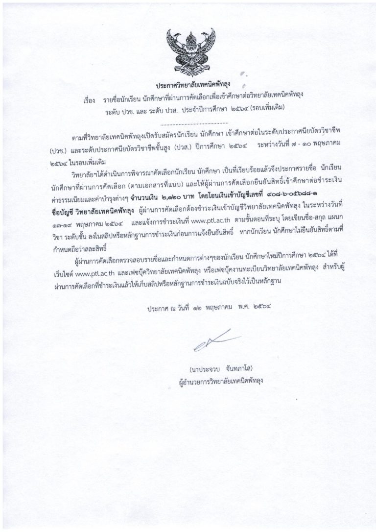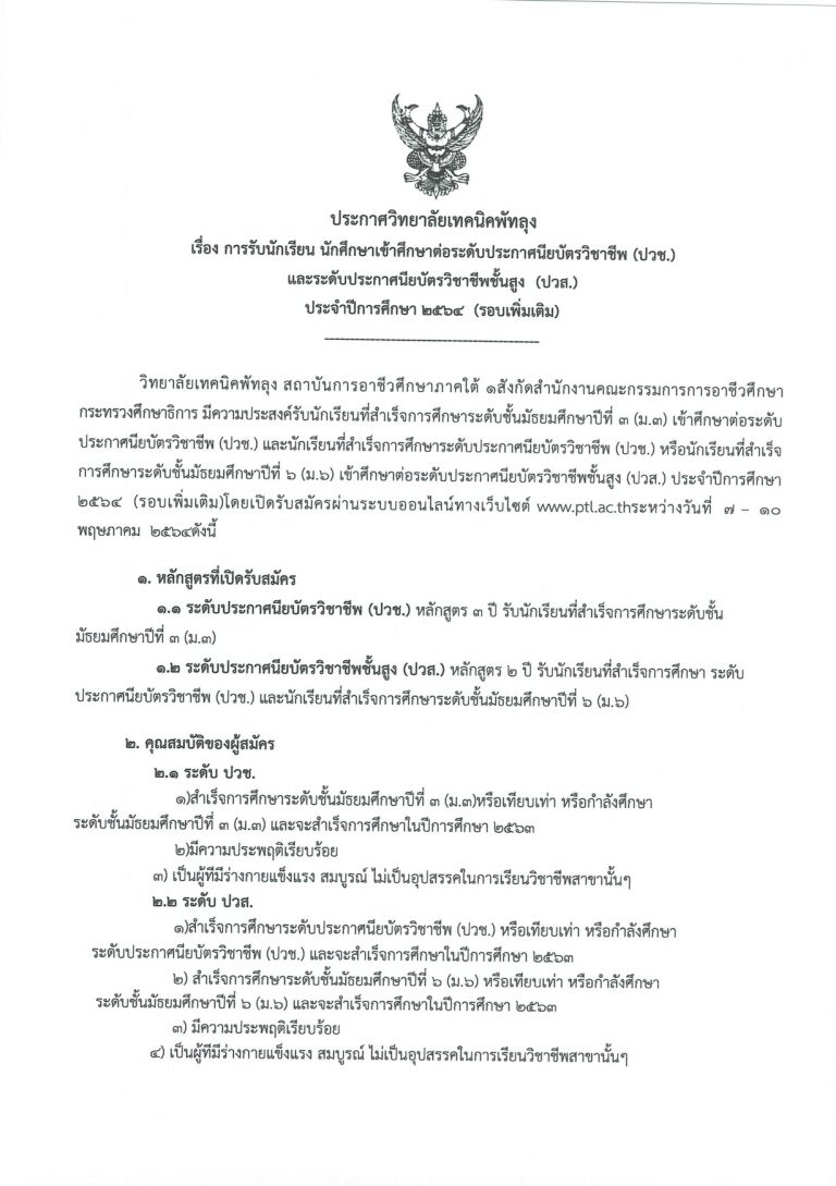 ประกาศวิทยาลัยเทคนิคพัทลุงเรื่อง การรับนักเรียน นักศึกษาเข้าศึกษาต่อระดับประกาศนียบัตรวิชาชีพ (ปวช.) และระดับประกาศนียบัตรวิชาชีพชั้นสูง (ปวส.) ประจำปีการศึกษา 2564 (รอบเพิ่มเติม)
