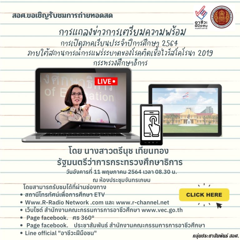สอศ.ขอเชิญรับชมการถ่ายทอดสด การแถลงข่าวการเตรียมความพร้อม การเปิดภาคเรียนประจำปีการศึกษา 2564 ภายใต้สถานการณ์การแพร่ระบาดของโรคติดเชื้อไวรัสโคโรนา 2019 กระทรวงศึกษาธิการ