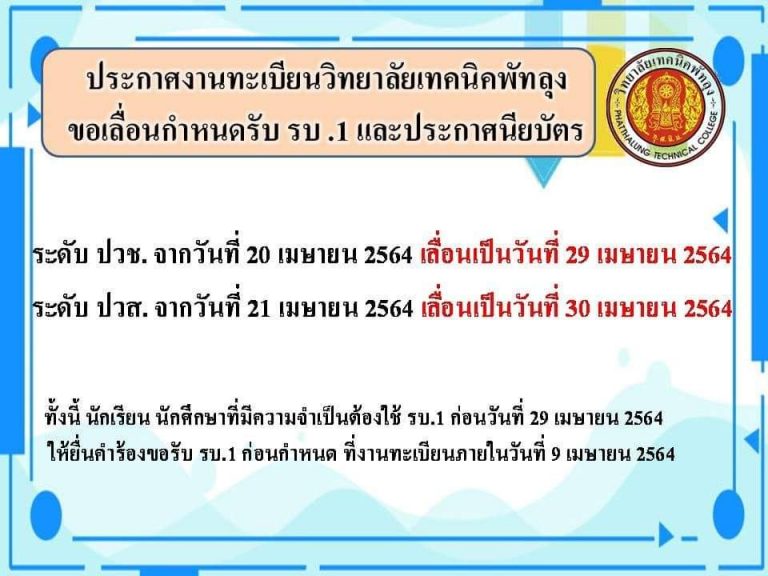ประกาศ วิทยาลัยเทคนิคพัทลุง แจ้งหยุดเรียนกรณีพิเศษ 2 วัน ระหว่างวันที่ 20-21 พฤศจิกายน 2568