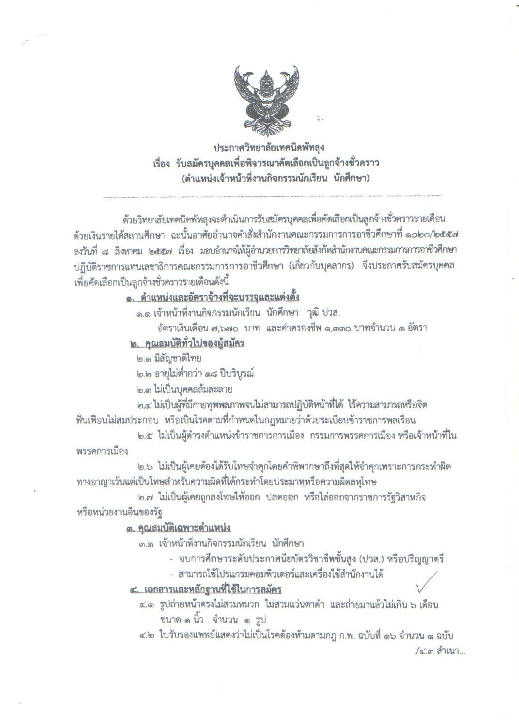 รับสมัครบุคคลเพื่อพิจารณาคัดเลือกเป็นลูกจ้างชั่วคราว (ตำแหน่ง เจ้าหน้าที่งานกิจกรรมนักเรียน นักศึกษา)