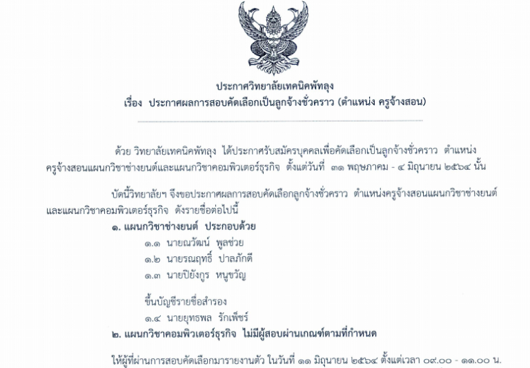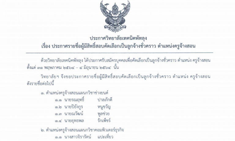 ประกาศวิทยาลัยเทคนิคพัทลุง เรื่อง ประกาศรายชื่อผู้มีสิทธิ์สอบคัดเลือกเป็นลูกจ้างชั่วคราว ตำแหน่งครูจ้างสอน