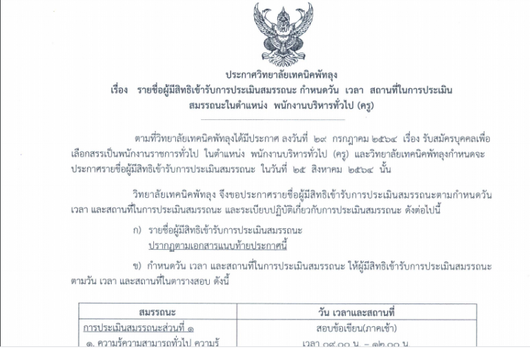 ประกาศวิทยาลัยเทคนิคพัทลุง เรื่อง รายชื่อผู้มีสิทธิเข้ารับการประเมินสมรรถนะ กำหนดวัน เวลาและสถานที่ในการประเมินสมรรถนะในตำแหน่งพนักงานบริหารทั่วไป(ครู)