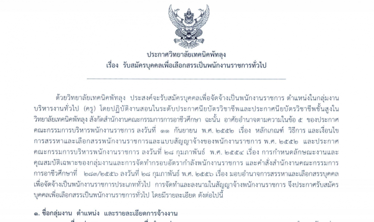 ประกาศวิทยาลัยเทคนิคพัทลุง เรื่อง รับสมัครบุคคลเพื่อเลือกสรรเป็นพนักงานราชการทั่วไป