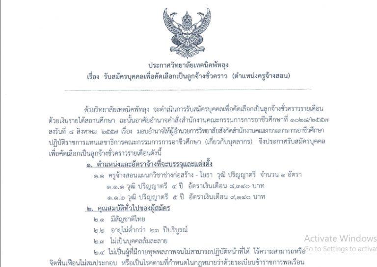 ประกาศ วิทยาลัยเทคนิคพัทลุง เรื่องรับสมัครบุคคลเพื่อคัดเลือกเป็นลูกจ้างชั่วคราว (ตำแหน่งครูจ้างสอน)