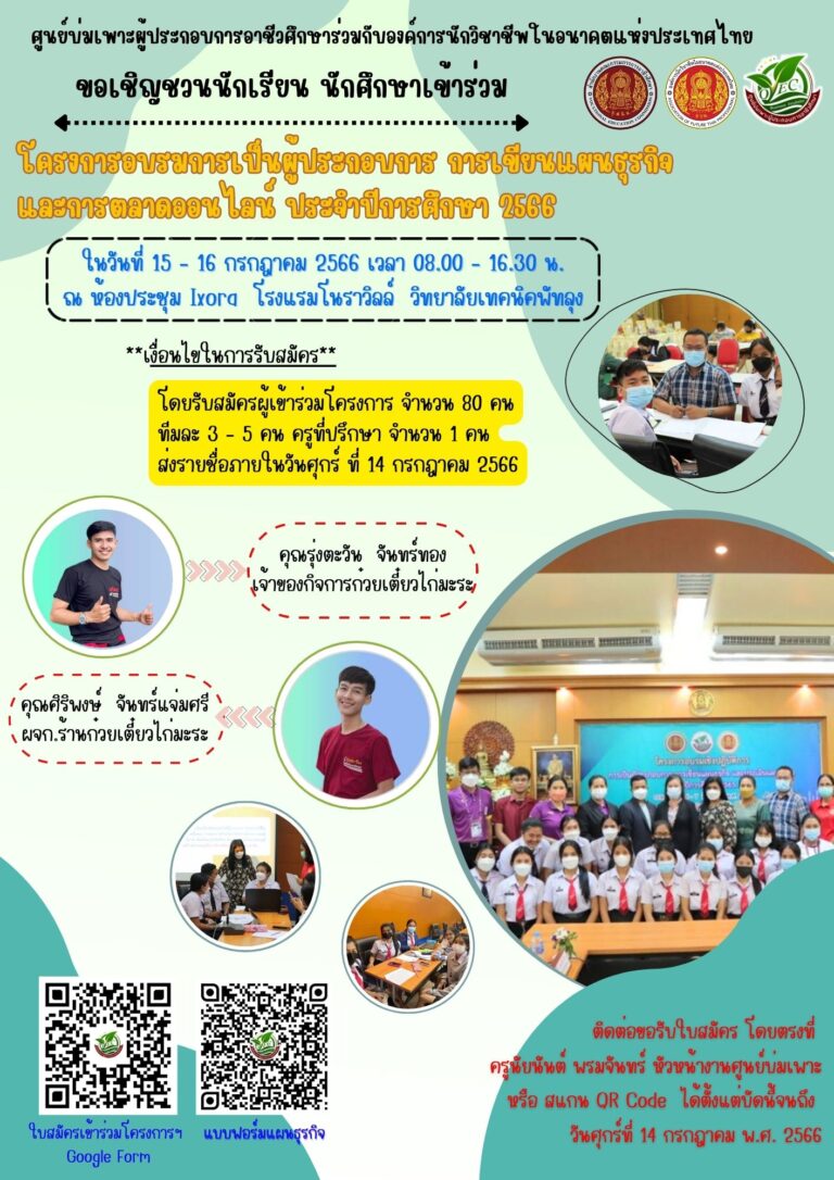 ขอเชิญชวนนักเรียนนักศึกษาเข้าร่วมโครงการอบรมการเป็นผู้ประกอบ การเขียนแผนธุรกิจและการตลาดออนไลน์ ประจำปีการศึกษา 2566
