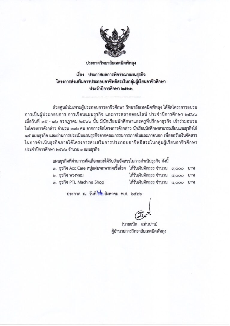 ศูนย์บ่มเพาะผู้ประกอบการอาชีวศึกษา วิทยาลัยเทคนิคพัทลุง ภายใต้การบริหารงานของ นายธนิต แท่นปาน ผู้อำนวยการวิทยาลัยเทคนิคพัทลุง เข้าร่วมจัดบูธนิทรรศการ งานเปิดโลกการศึกษา สร้างปัญญาเด็กพัทลุง ครั้งที่ 17 ประจำปี 2566 “รวมพลคนเมืองลุง เชิดชูภูมิปัญญา น้อมนำศาสตร์พระราชา พัฒนาการศึกษาสู่สากล”