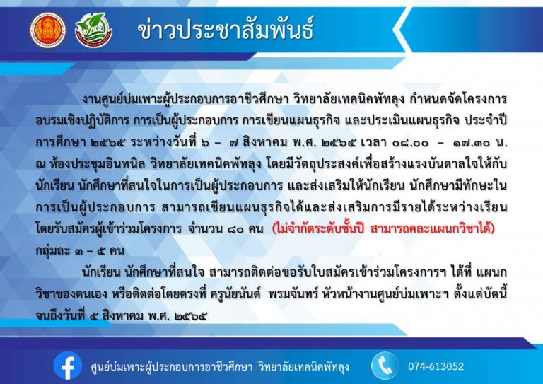 ศูนย์บ่มเพาะผู้ประกอบการอาชีวศึกษา วิทยาลัยเทคนิคพัทลุง กำหนดจัดโครงการอบรมเชิงปฏิบัติการ การเป็นผู้ประกอบการ การเขียนแผนธุรกิจ และประเมินแผนธุรกิจ ประจำปีการศึกษา 2565