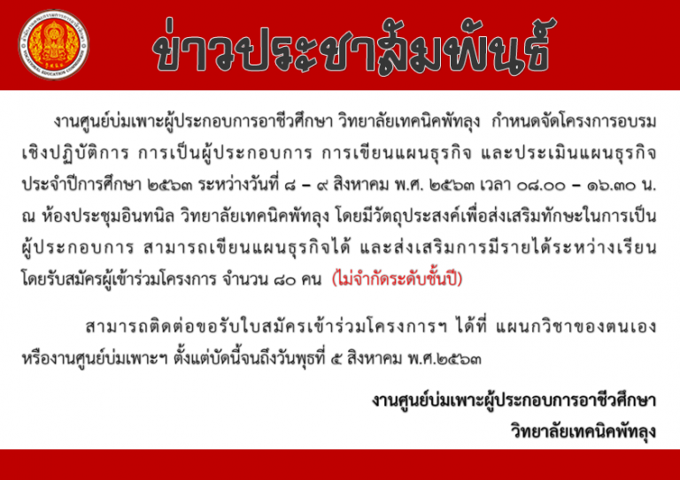 ศูนย์บ่มเพาะผู้ประกอบการอาชีวศึกษา วิทยาลัยเทคนิคพัทลุง กำหนดจัดโครงการอบรมเชิงปฏิบัติการ การเป็นผู้ประกอบการ การเขียนแผนธุรกิจ และประเมินแผนธุรกิจ ในรูปแบบออนไลน์ ประจำปีการศึกษา 2564