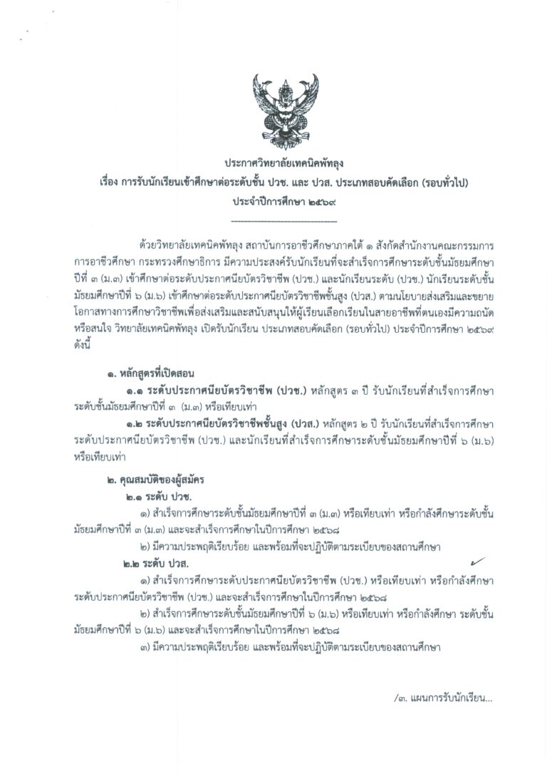 ประกาศจากงานทะเบียน วิทยาลัยเทคนิคพัทลุง การรับนักเรียนนักศึกษาเข้าศึกษาต่อระดับชั้น ปวช.และ ปวส. (รอบทั่วไป) ประจำปีการศึกษา 2569