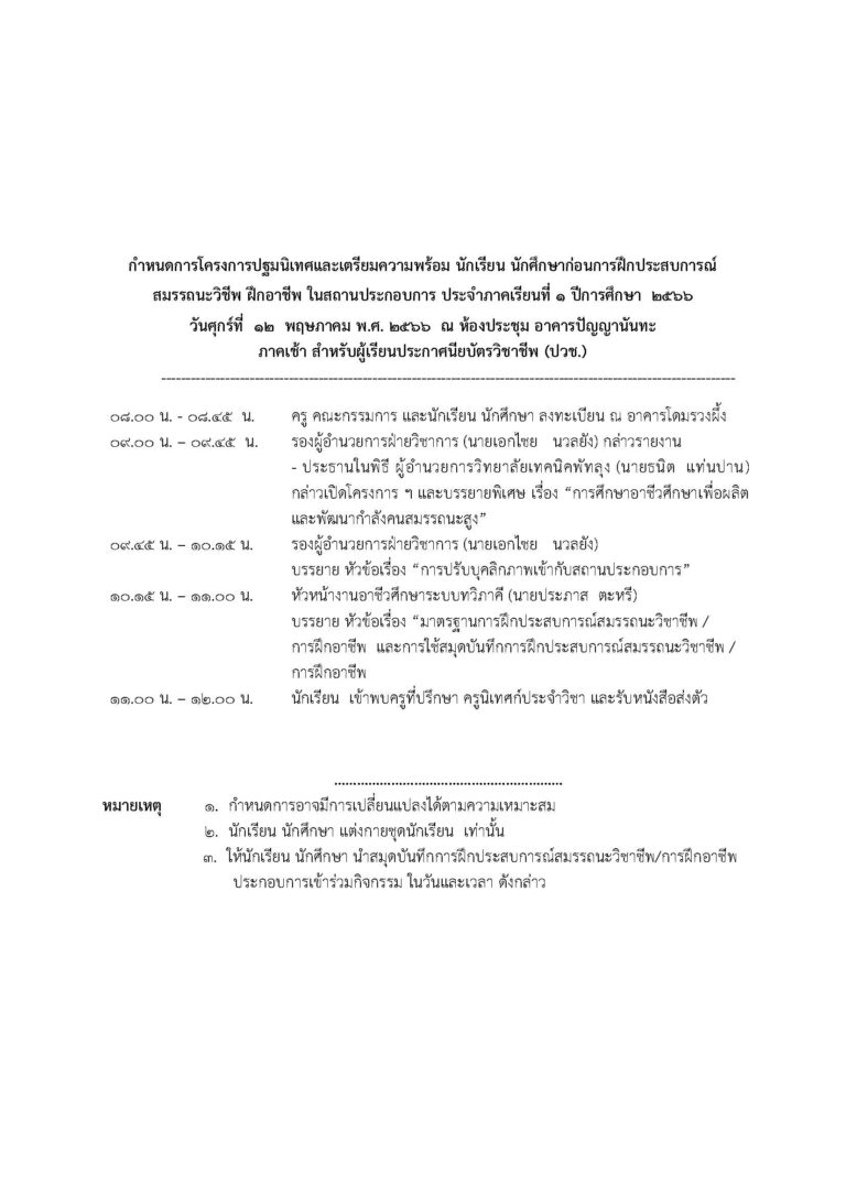กำหนดโครงการปฐมนิเทศและเตรียมความพร้อมนักเรียน นักศึกษาก่อนการฝึกประสบการณ์สมรรถนะวิชาชีพ ฝึกอาชีพ ในสถานประกอบการ ประจำภาคเรียนที่ 1 ปีการศึกษา 2566