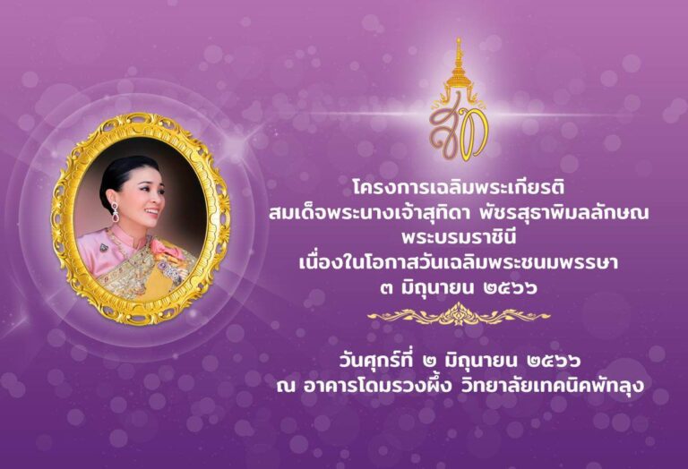 ขอเชิญคณะผู้บริหาร คณะครู เจ้าหน้าที่ บุคลกรทางศึกษา และนักเรียน นักศึกษาเข้าร่วมโครงการเฉลิมพระเกียรติ สมเด็จพระนางเจ้าสุทิดา พัชรสุธาพิมลลักษณ เนื่องในโอกาสวันเฉลิมพระชนมพรรษาพระบรมราชินี