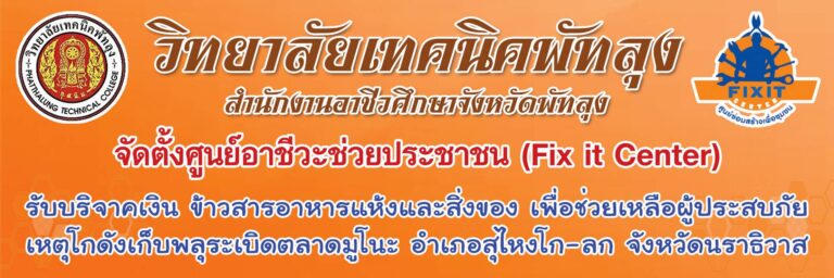 วิทยาลัยเทคนิคพัทลุง สำนักงานอาชีวศึกษาจังหวัดพัทลุง จัดตั้งศูนย์อาชีวะช่วยประชาชน (Fix it Center) รับบริจาคเงิน ข้าวสารอาหารแห้งและสิ่งของ เพื่อช่วยเหลือผู้ประสบภัยเหตุโกดังเก็บพลุระเบิดตลาดมูโนะ อำเภอสุไหงโก-ลก จังหวัดนราธิราส