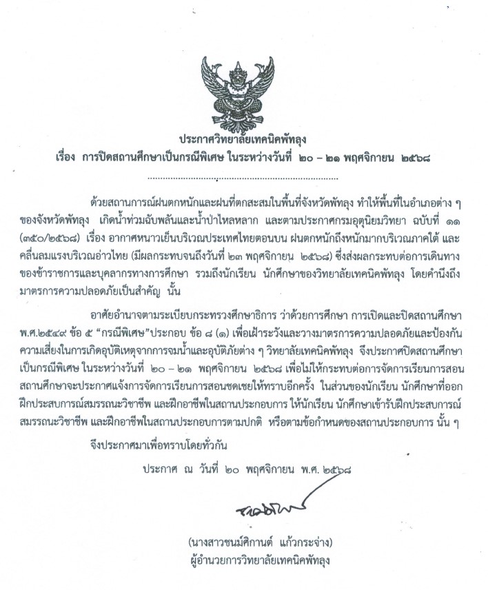 ประกาศ วิทยาลัยเทคนิคพัทลุง แจ้งหยุดเรียนกรณีพิเศษ 2 วัน ระหว่างวันที่ 20-21 พฤศจิกายน 2568