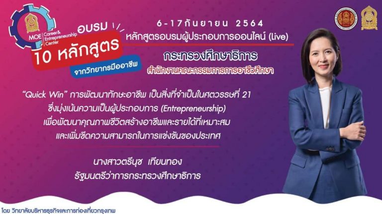 กระทรวงศึกษาธิการโดย สำนักงานคณะกรรมการการอาชีวศึกษา เปิดหลักสูตรอบรมผู้ประกอบการออนไลน์ (Live) ระหว่างวันที่ 6 – 17 กันยายน 2564
