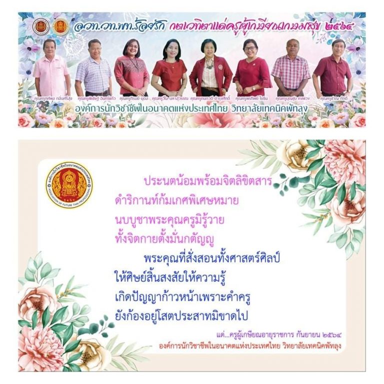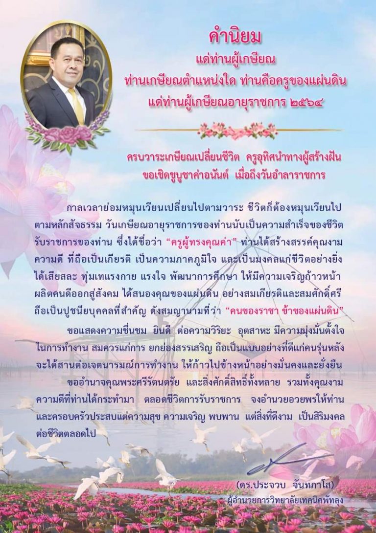 ขอแสดงความยินดีแด่เพื่อนครูผู้เกษียณอายุราชการทุกท่าน จิตวิญญาณและคุณงามความดีที่ท่านได้ทำไว้ จะยังคงสถิตอยู่ในใจลูกศิษย์ทุกคน ดร.ประจวบ จันทภาโส ผู้อำนวยการวิทยาลัยเทคนิคพัทลุง