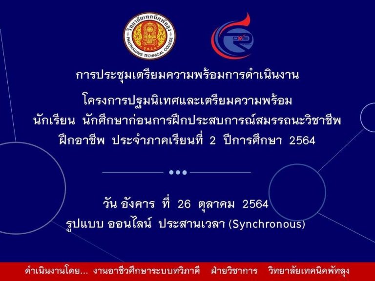 ในวันอังคาร ที่ 26 ตุลาคม 2564 เวลา 14.00 น. นายณัฐพงศ์ สำแดง รองผู้อำนวยการฝ่ายวิชาการ นายประภาส ตะหรี หัวหน้างานอาชีวศึกษาระบบทวิภาคี หัวหน้าแผนกวิชา และเจ้าหน้าที่งานอาชีวศึกษาระบบทวิภาคีประจำแผนกวิชา ได้ประชุมเตรียมความพร้อมการดำเนินงานโครงการปฐมนิเทศและเตรียมความพร้อม นักเรียน นักศึกษา ก่อนการฝึกประสบการณ์สมรรถนะวิชาชีพ ฝึกอาชีพ ในสถานประกอบการ ประจำภาคเรียน ที่2 ปีการศึกษา 2564 ในรูปแบบออนไลน์